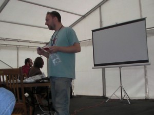 There were three spaces for talks, two marquees in the field itself, both with projectors and power, and the pub’s own “Media Barn” – a converted barn with a projector, chairs, carpet etc.