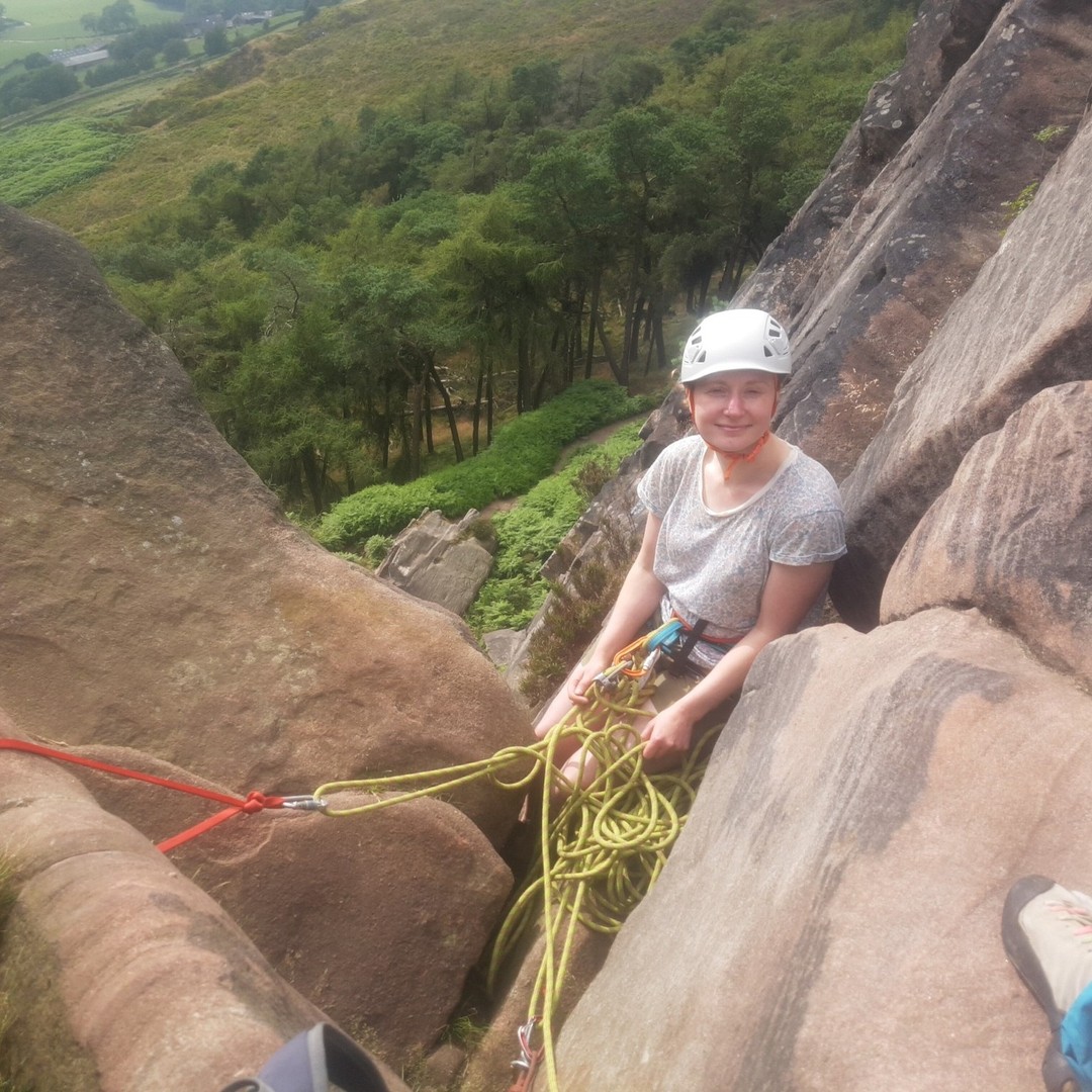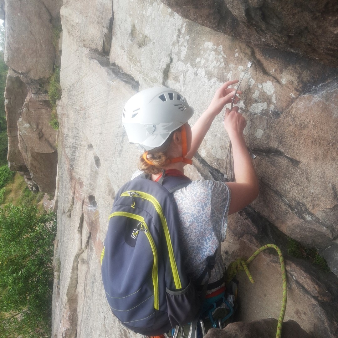 Katie smashing the awkward traverse on Pedestal Route and doing her first multipitch last year.